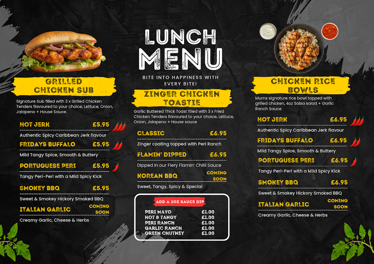 The menu features comforting drinks like rich espressos, creamy caramel coffees, and smooth iced lattes—perfect for a morning pick-me-up or a gentle afternoon pause. Alongside these, there’s a range of lovingly prepared grilled chicken subs and zinger toasties, each bringing warm, familiar spices and sauces that suit a relaxed, friendly atmosphere.